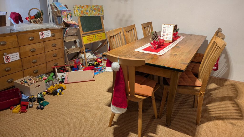 Festlich geschmückt (nach Saison) werden Sie in unserem Nebenraum empfangen und können einen Platz für größere Gruppen finden. Insgesamt finden in diesem Raum bis zu 80 Personen Platz und es gibt auch eine extra eingerichtete Ecke für Kinder mit Spielzeug, damit es den jüngsten Gästen nicht langweilig wird und die Eltern oder Großeltern etwas Zeit zum Entspannen finden. Dieser Raum eignet sich auch für Ihre Feier in unserem Café mit warmen Speisen.